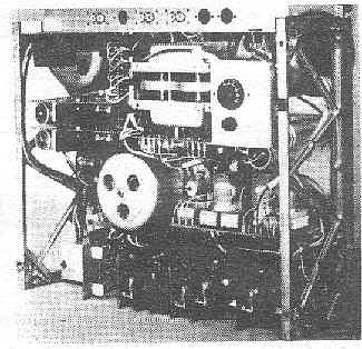 This takes supplies between 110 and 250 volts and has five secondaries to feed motors, relays, early transistor stages (via an electronically regulated power supply) and two power amplifiers. The latter, formed of a heat sink for the output pair and a printed circuit board for the rectifier smoothing and driver components, plug edgewise into sockets and are held by a locking screw. They can thus be added to the "Less Power Amplifier" versions at a later date if required.
